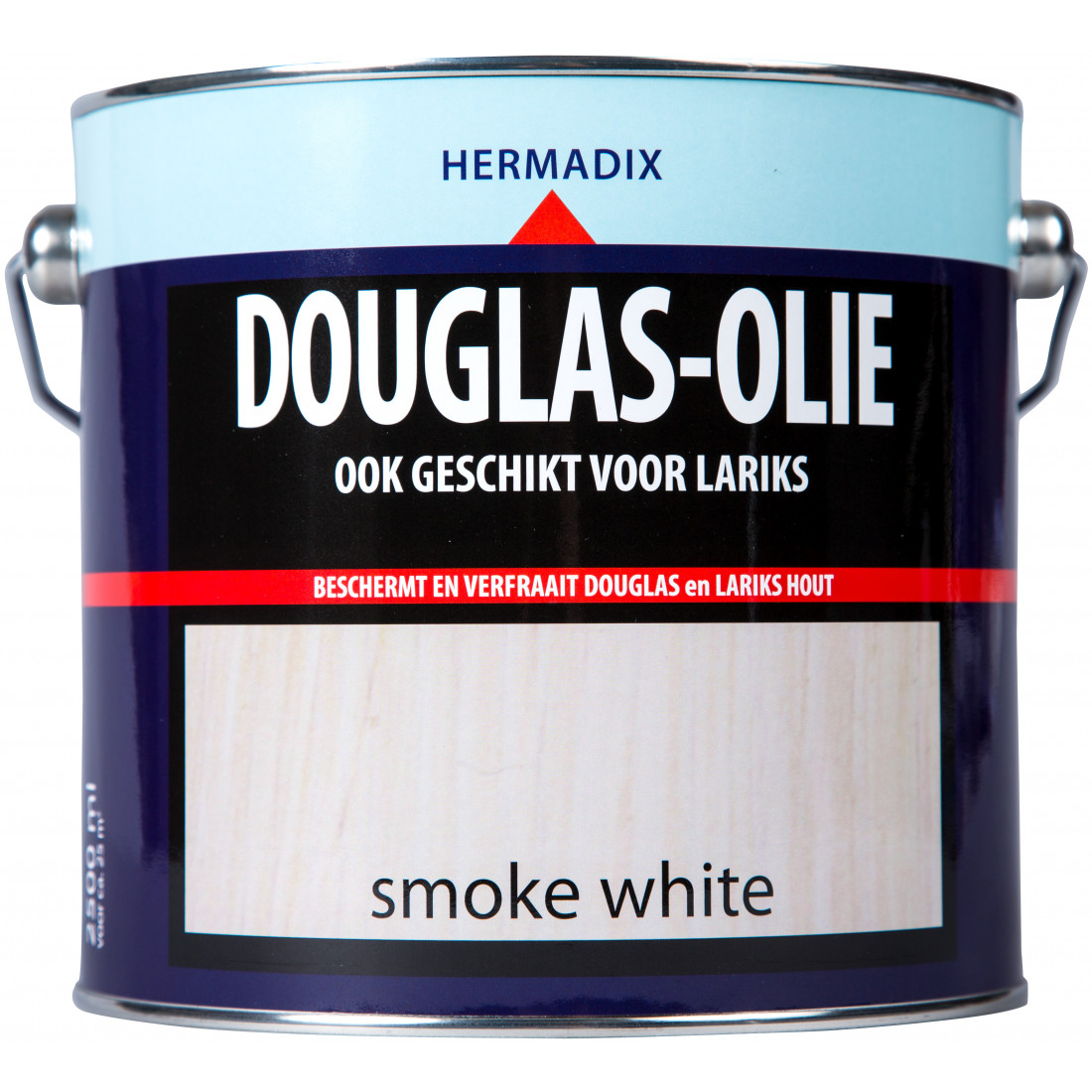 Hermadix Douglas olie smoke white is speciaal ontwikkeld voor nieuw en oud douglas/lariks hout. Douglas olie geeft een transparante uitstraling zodat de houtnerf en houtstructuur zichtbaar blijven. Douglas olie dringt diep in het hout en geeft een matte, natuurlijke uitstraling. Douglas olie droogt snel en is makkelijk verwerkbaar. 1-2 lagen douglas olie zijn voldoende voor een prachtig resultaat. Bij onderhoudslagen lichtjes tussendoor schuren. Douglas olie is een watergedragen, mens- en milieuvriendelijk olie op basis van natuurlijke ingrediënten.