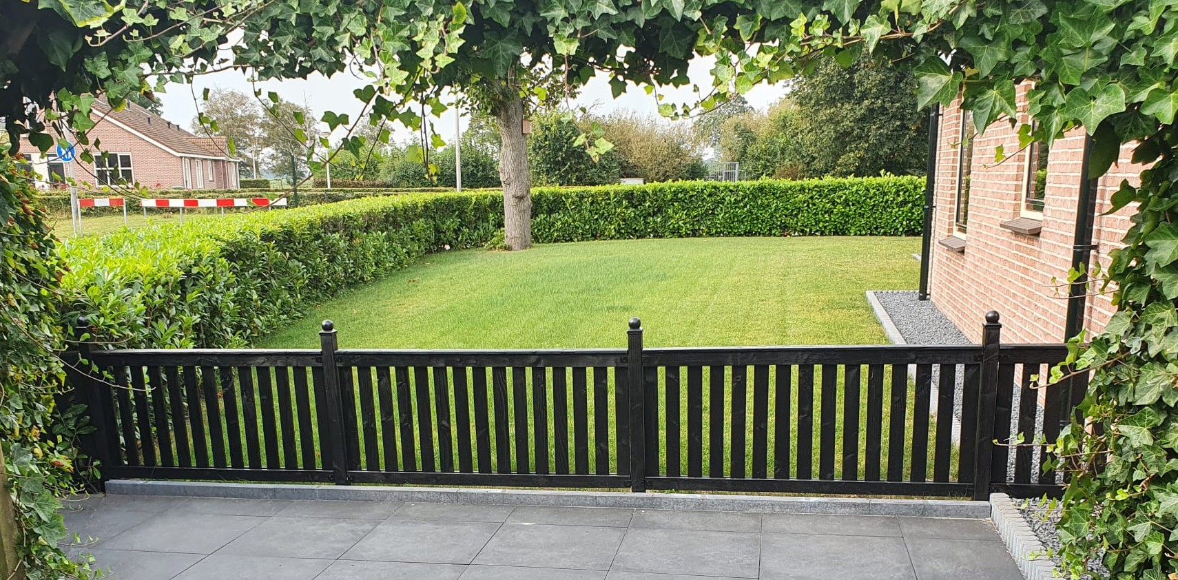 Dit type tuinhek is een hardloper in deze categorie. Deze zijn geproduceerd uit zwart gespoten grenenhout. Het hout wordt voor productie 2x zwart gespoten wat zorgt voor een mooi dekkend geheel. Bij deze tuinhekken raden wij onze zwart gespoten palen aan met een diameter van 7 of 9 cm. Voor een mooie afwerking van de palen kunt u ervoor kiezen om een piramidekapje of bol op de paal te bevestigen. Voor de bevestiging van het hekwerk heeft u per tuinhek één set L-beslag nodig, deze hebben wij ook in zwart gepoedercoat.